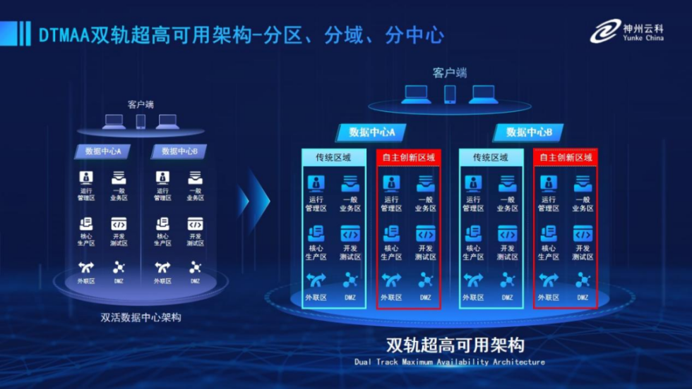为帮助金融客户更好地应对数字经济时代对可持续性的高要求,实现“信创”与“数字化”齐头并进,b体育官网推出了双轨超高可用架构。该架构在双活数据中心的分区调度基础上,增加信创域和非信创域的分域调度,实行信创域与传统域应用全量部署,使双中心运营变为双中心四区域并行运行,互为多活,将“0到1”的单轨建设道路变为分区分域协同的多活双轨超高可用架构。帮助客户在新架构下,保障“信创”的同时解决性能瓶颈,提升稳定性,保证应用可持续性,最终实现信创区域和非信创区域的平滑过渡,完成国产化替代目标。